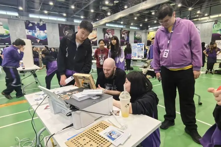 周五下午,羽毛球馆成为了同学们作品的展厅。AI课程训练的游戏端自动避障机器人、卡魅课程设计的激光切割作品、STEAM课程搭建的创意模型,一件件作品凝聚着同学们的奇思妙想。其中,高中学生Eva开发的AI游戏机器人凭借真人玩家已无法战胜的精准操作,成为吸引无数人驻足的焦点。