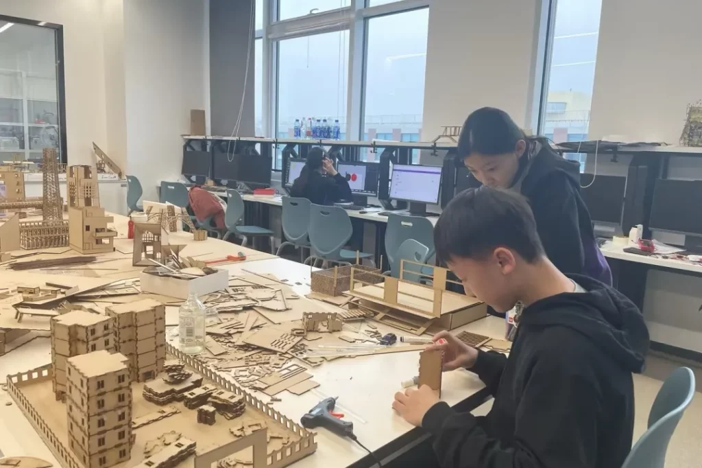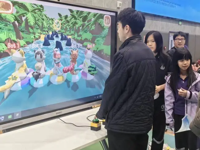 On Friday afternoon, the badminton hall became an exhibition space for students’ projects. From AI game-trained obstacle-avoiding robots to laser-cut creations from the CAME course and creative models built in STEAM classes, each project embodied the students’ ingenuity. Among them, an AI game robot developed by Eva, a high school student, became a standout attraction due to its precise operations that no human player could beat, drawing crowds of fascinated onlookers.
